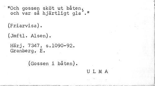 //// flOch gossen sköt ut båten ! //// och var så hjärtligt gla'.,? //// (Friarvisa). //// (Jmftl. Alsen). //// Härj. 7347, s.1090-92. Granberg, E. //// (Gossen i båten). //// U L M A //// i ////