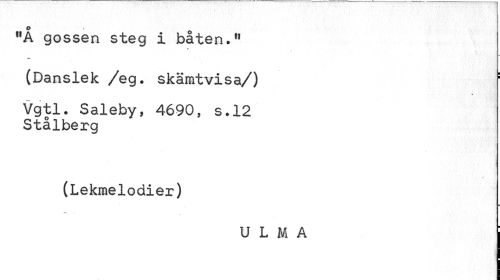 //// 1 //// MÅ gossen steg i båten." //// (Danslek /eg• skämtvisa/) 1 //// Vgtl. Saleby, 4690, s.12 Stålberg //// (Lekmelodier) //// ... //// U L M A j ////