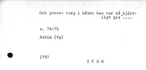 //// — ~ . ""v " . --- //// > - »• t- ---„ //// .' . ... ..„ //// . . . j //// V . .. . _ //// Och gossen steg i båten han var så hjärtligt gla ... //// s. 74-75 Askim (Vg) //// I //// ..-«> s //// ® 1797 //// I F G H //// J. ... ////