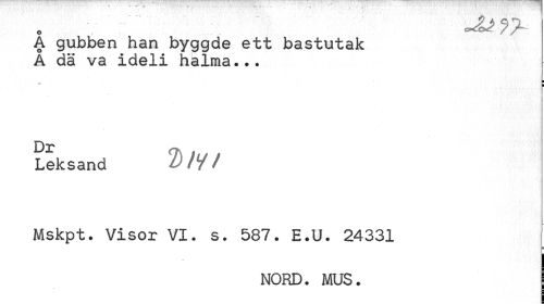 //// A gubben han byggde ett bastutak A dä va ideli halma... //// ¦ ¦ //// Leksand //// Dm //// Mskpt. Visor VI. s. 587. E.U. 24331 //// NORD. MUS. j ////