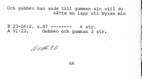 //// Och gubben han sade till gumman sin vill du ! //// sätta en lapp uti byxan min //// B 23-24:2, s.47--- 4 str. i //// A 91:23, Gubben och gumman 3 str. i //// ¦ //// RA ////