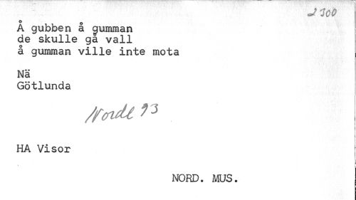 //// J 100 //// A gubben å gumman de skulle ga vall //// å gumman ville inte mota Nä //// Götlunda //// /fcatU ^ //// HA Visor //// NORD. MUS. ////