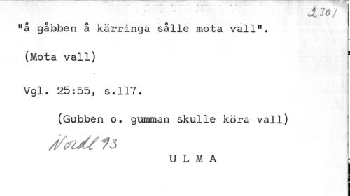 //// / Ji30/ //// 11 å gåbben å kärringa sålle mota vall11 • //// (Mota vall) ! //// Vgl. 25:55, s.117. //// (Gubben o. gumman skulle köra vall) //// få //// U L M A j ////