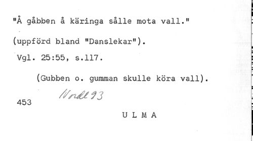 //// lfÅ gåbben å käringa sålle mota vall.11 : //// (uppförd bland "Danslekar"). //// l //// Vgl. 25:55, s.117. j //// (Gubben o. gumman skulle köra vall). //// E //// //mä 13 \ //// 453 . //// U L M A ////