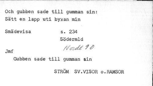 //// Och gubben sade till gumman sin: Satt en lapp uti byxan min //// i //// Smädevisa s. 234 //// Södermld //// Gubben sade till gumman sin //// * //// STRÖM SV.VISOR o.RAMSOR ////