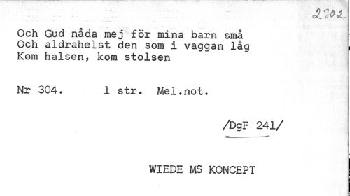 //// : : . - - JLloJL. //// .'* .•• ¦»• •-. ---• , •• -r ¦y y— • //// Och Gud nåda mej för mina barn små //// Och aldrahelst den som i vaggan låg i //// Kom halsen, kom stoisen Nr 304. 1 str. Mel.not. //// /DgF 241/ WIEDE MS KONCEPT ////