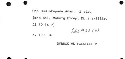 //// Och Gud skapade Adam. 1 str. //// (med mel. Moberg Except Kb:s skilltr. //// \ //// 21 80 16 ?) //// Van ii (v //// s. 109 B. //// DYBECK MS FOLKLORE 5 ////