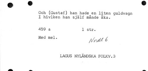 //// Och (Gustaf) han hade en liten guldvagn I hivlken han själf månde åka. //// 459 a 1 str. //// Medme1' /i/mUé //// LAGUS NYLÄNDSKA FOLKV.3 //// Jv ' . ////