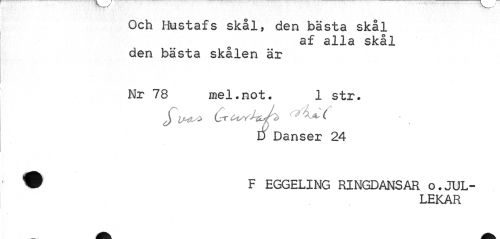 //// Och Hustafs skål, den bästa skål //// af alla skål //// den bästa skålen är //// Nr 78 mel.not. 1 str. //// D Danser 24 //// ? F EGGELING RINGDANSAR o.JUL- //// LEKAR ////