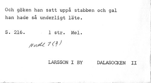 //// ! //// i //// j //// Och göken han satt uppå stabben och gal han hade så underligt läte. //// S. 216. 1 str. Mel. | //// i //// LARSSON I BY DALASOCKEN II ////