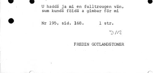 //// U haddä ja mi en fulltrougen vän, sum kundä föidä a gimbar för mi //// ^ Nr 195, sid. 168. 1 str. //// D/n //// FREDIN GOTLANDSTONER ////