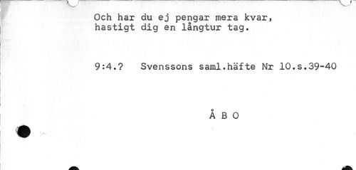 //// Och har du ej pengar mera kvar, hastigt dig en långtur tag. //// 9:4.? Svenssons saml.häfte Nr 10.s.39-40 //// ÅBO ////