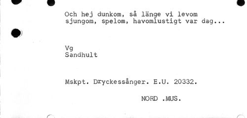 //// Och hej chankom, så länge vi levom sjungom, spelom, havomlustigt var dag... //// m ¦ //// vg //// Sandhult //// Mskpt. Dryckessånger. E.U. 20332. //// NORD .MUS. ////