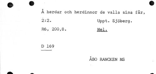 //// o //// A herdar och herdinnor de valla sina får, 2:2. Uppt. Sjöberg. //// R6, 200,8. Mel. //// D 169 //// ÅBO RANCKEN MS //// % ////