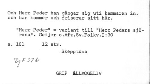 //// Och Herr Peder han gångar sig uti kammaren in, och han kommer och friserar sitt hår, //// ¦ i //// "Herr Peder" = variant till "Herr Peders sjöresa". Geijer o.Afz.Sv.Folkv.I:30 //// « ? //// s. 181 12 str. //// Skepptuna //// l)cf37é> i //// GRIP ÄLLMOGELIV //// i ////