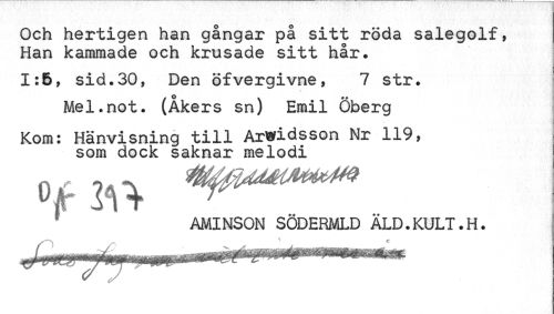 //// Och hertigen han gångar på sitt röda salegolf, Han kammade och krusade sitt hår. //// 1:5, sid.30, Den öfvergivne, 7 str. //// Mel.not. (Åkers sn) Emil Öberg //// Kom: Hänvisning till Arwidsson Nr 119, //// som dock saknar melodi //// AMINSON SÖDERMLD ÄLD.KULT.H. //// ^wvcs^^m ... ////