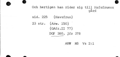 //// Och hertigen han rider sig till Hafsfruens //// gård //// sid. 225 (Havsfrun) //// 23 str. (Arw. 150) //// (GAfz.II 77) DGF 380, jfr 378 //// ARW MS Vs 2:1 ////