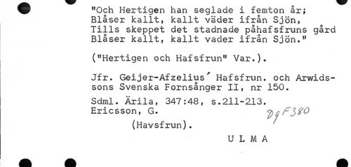 //// W "uch Hertigen han seglade i iemton ar; //// Blåser kallt, kallt väder ifrån Sjön, Tills skeppet det stadnade påhafsfruns gård Blåser kallt, kallt vader ifrån Sjön." //// ("Hertigen och Hafsfrun" Var.). //// Jfr. Geijer-Afzelius' Hafsfrun. och Arwids-sons Svenska Fornsånger II, nr 150. //// Sdml. Ärila, 347:48, s.211-213. Ericsson, G- J)ff3?0 //// (Havsfrun). //// U L M A ////