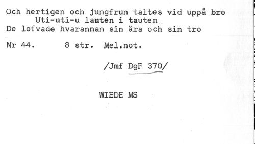 //// Och hertigen och jungfrun taltes vid uppå bro //// Uti-uti-u lauten i tauten De lofvade hvarannan sin ära och sin tro //// ! //// Nr 44. 8 str. Mel.not. //// I //// i //// = //// /Jmf DgF 37j0/ ' //// i //// WIEDE MS ////