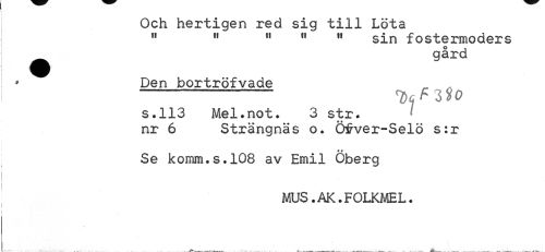 //// Och hertigen red sig till Löta » 11 11 " 11 sin fostermoders //// gård //// Den bortrofvade ^ , --y cz$0 //// s.113 Mel.not. 3 str- //// nr 6 Strängnäs o. Öirver-Selö s:r //// Se komm.s.108 av Emil Oberg //// MUS.AK.FOLKMEL. ////