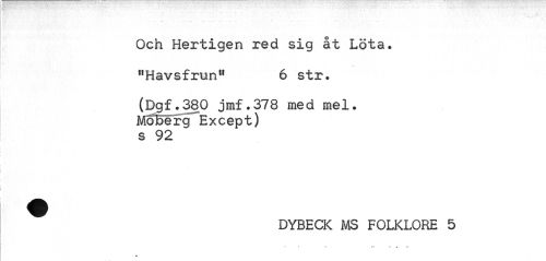 //// Och Hertigen red sig åt Lota. "Havsfrun" 6 str. //// (Dgf.380 jmf.378 med mel. Moberg Except) s 92 //// DYBECK MS FOLKLORE 5 //// * t - .T" — t //// * ////