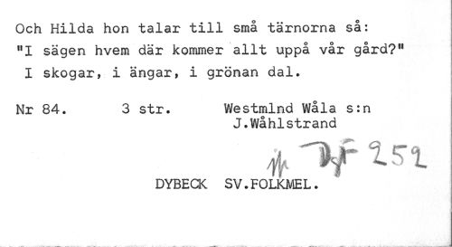 //// Och Hilda hon siXsm? *txll sma tarnorna sa: 111 sägen hvem där kommer allt uppå vår gård?" I skogar, i ängar, i grönan dal. //// Nr 84. 3 str. Westmlnd Wåla s:n //// J.Wåhlstrand //// DYBECK SV.FOLKMEL. //// t I 1 { m •{ • ////