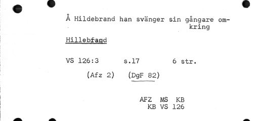 //// O 0 //// A Hildebrand han svänger sin gangare omkring //// i //// Hillebfagd //// VS 126:3 s.17 6 str. //// (Afz 2) (DgF 82) //// •mtmmmmmmmma^mmmmmmm //// AFZ MS KB KB VS 126 ////