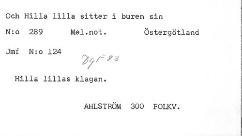 //// Och Hilla lilla sitter i buren sin //// N:o 289 Mel.not. Östergötland //// Jraf N:o 124 //// Hilla lillas klagan. //// j //// AHLSTRÖM 300 FOLKV. I ////