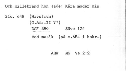 //// Och Hillebrand hon sade: Kära moder min //// Sid. 648 (Havsfrun) //// (G.Afz.II 77) DGF 380^ Säve 124 //// Med musik (på s.654 i hskr.) //// ARW MS Vs 2:2 ////