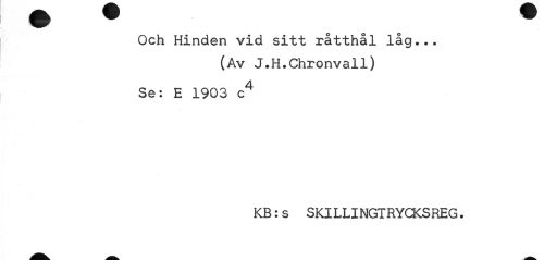 //// Och Hinden vid sitt råtthål låg... //// (Av J.H.Chronvall) //// Se: E 1903 c4 //// KB:s SKILLINGTRYCKSREG. ////