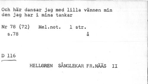//// Och här dansar jag med lilla vännen min den jag har i mina tankar //// Nr 78 (72) Mel.not. 1 str. s.78 å //// D 116 //// HELLOREN SÅNGLEKAR FR.NÄÄS II ////