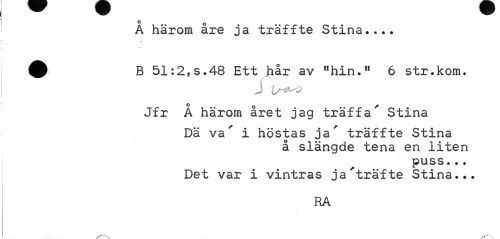 //// Å härom åre ja träffte Stina... £ B 51:2,s.48 Ett hår av "hin." 6 str.kom. //// J Xt^o //// Jfr Å härom året jag träffa' Stina //// Dä va' i höstas ja' träffte Stina //// å slängde tena en liten //// puss... //// Det var i vintras ja'träfte Stina... //// RA //// --X ////