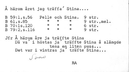 //// Å härom året jag träffa' Stina... //// B 59:1,s.56 Pelle och Stina. 9 str. B 61,s.85 • » " 9 str.,mel. //// B 70:ls,120 " » » 6 str. //// B 79:2,s.116 « " " 9 str. //// i //// Jfr Å härom åre ja träffte Stina //// Dä va' i höstas ja' träffte Stina å slängde //// tena er) liten puss... Det var i vintras ja träfte Stina... //// J \ //// RA ////