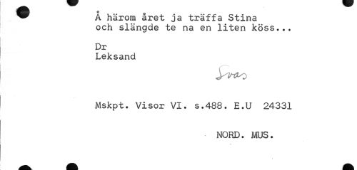 //// ® Å härom året ja träffa Stina //// och slängde te na en liten köss... //// Dr //// Leksand //// yir^j //// Mskpt. Visor VI. s.488. E.U 24331 //// ¦ NORD. MUS. //// / ////