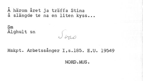 //// Å härom året ja träffa Stina å slängde te na en liten kyss... //// Sm //// Älghult sn //// Mskpt. Arbetssånger I,s.l85. E.U. 19549 //// NORD.MUS. ////