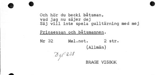 //// Och hor du becki båtsman, vad jag nu säjer dej //// Säj vill inte spela gulltärning med mej Prinsessan och båtsmannen. //// Nr 32 Mel.not. 2 str. //// (Allmän) //// 2Saft* * //// BRAGE VISBOK ////
