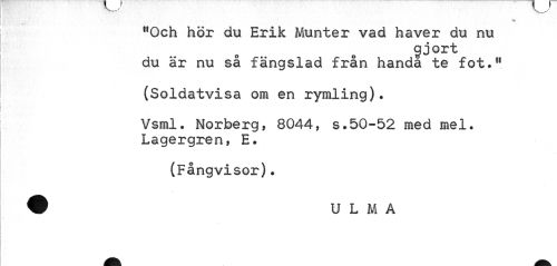//// "Och hör ciu Erik Munter vad haver du nu //// gjort //// du är nu så fängslad från handa te fot." (Soldatvisa om en rymling). //// Vsml. Norberg, 8044, s.50-52 med mel. Lagergren, E. //// (Fångvisor). • U L M A ////
