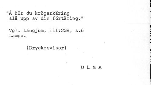 //// i //// f,Å hör du krögarkäring slå upp av din förtäring." //// ; //// Vgl. Längjum, 111:238, s.6 ! //// Lampa. ; //// i //// % ¦ //// (Dryckesvisor) , //// ¦ //// * //// i //// \ u //// U L M A //// % ////