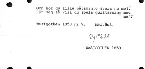 //// Och hör du lille båtsman,o svara nu mej T För säg så vill du spela gulltärning med //// mej? //// Westgöthen 1858 nr 9. Mel.fint. //// s>« n zs //// WÄSTGÖTHEN 1858 ////