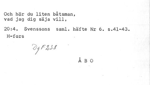 //// Och hör du liten båtsman, vad jag dig säja vill, //// 20:4. Svenssons saml. häfte Nr 6. s.41-43. H-fors //// ÅBO //// « ////
