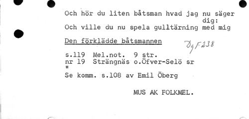 //// Och hör du liten båtsman hvad jag nu säger //// dig: //// ^^ Och ville du nu spela gulltärning med mig //// Den förklädde båtsmannen ^ //// s.119 Mel.not. 9 str. //// nr 19 Strängnäs o.Qfver-Selö sr //// ii //// Se komm. s.108 av Emil Öberg //// MUS AK FOLKMEL. //// \ ////