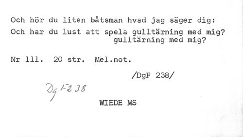 //// Och hör du liten båtsman hvad jag säger dig: //// Och har du lust att spela gulltärning med mig? //// gulltärning med mig? //// Nr 111. 20 str. Mel.not. //// /DgF 238/ //// & 3S //// WIEDE MS ////