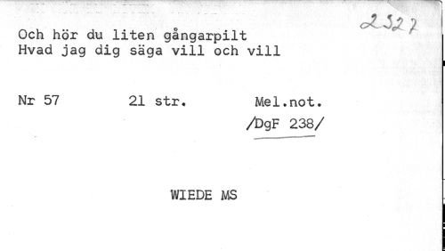 //// 2 //// Och hör du liten gangarpilt Hvad jag dig säga vill och vill //// i //// Nr 57 21 str. Mel.not. //// /DgF 238/ //// WIEDE MS ////