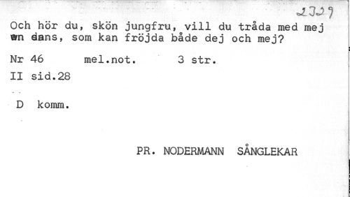 //// 7 //// Och hör du, skön jungfru, vill du tråda med mej wn dans, som kan fröjda både dej och mej? //// Nr 46 mel.not, 3 str. //// II sid.28 //// D komm. //// PR. NODERMANN SÅNGLEKAR ////