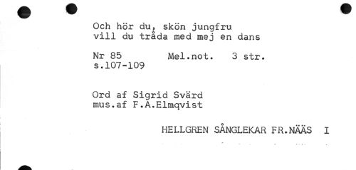 //// Och hör du, skön jungfru vill du tråda med mej en dans //// Nr 85 Mel.not. 3 str. //// s.107-109 //// Ord af Sigrid Svärd mus.af F.A.Elmqvist //// HELLGREN SÅNGLEKAR FR.NÄÄS I //// ¦¦¦>¦ .t * f .r ////
