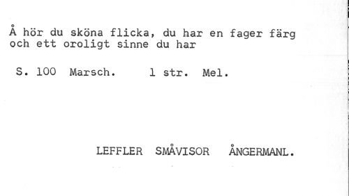 //// Å hör du sköna flicka, du har en fager färg och ett oroligt sinne du har //// S. 100 Marsch. 1 str. Mel. j //// LEFFLER SMÅVISOR ÅNGERMANL. ////