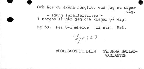 //// Och hör du sköna jungfru, vad jag nu säger //// dig, //// - sjung farallarallara -^^ i morgon sa går jag och klagar på dig. //// Nr 59. Per Svinaherde 11 str. Mel. //// CL f i //// ADOLFSSON-FORSLIN NYFUNNA BALLADVARIANTER //// ^—-- '-v ////