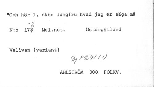 //// ¦ //// "Och hör X, skön Jungfru hvad jag er säga må //// -X . 1 //// N:o 17$ Mel.not. Östergötland //// / //// Valivan (variant) //// QU W / O //// AHLSTRÖM 300 FOLKV. ////
