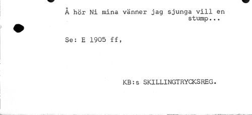 //// Å hör Ni mina vänner jag sjunga vill en //// stump... //// Se: E 1905 ff, //// KB:s SKILLINGTRYCKSREG. ////