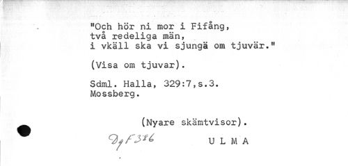 //// "Och hör ni mor i Fifång, //// två redeliga män, //// i vkäll ska vi sjunga om tjuvär." //// (Visa om tjuvar). //// Sdml. Halla, 329:7,s*3. Mossberg. //// ^^ (Nyare skämtvisor)• //// U L M A //// * ////